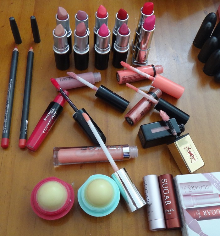 Lip Products: MAC lip pencil's in Cherry & Lasting Sensation, Top row: MAC Angel, Snob, Impassioned, Ruby Woo, Maybelline Vivids Vivid Rose; Bottom row: Creme d' Nude, Please Me, Candy Yum Yum, Girl About Town, Maybelline Vivid Fuchsia Flash. MAC Snob lipglass, Nyx Butter gloss Peaches & Cream, Rimmel Show Off Lip Laquer in Apocalyptic, Nyx Glam Gloss Aqua Luxe in The Last Party, Buxom Full on lip polish in Katie, YSL Glossy lip stain #19, EOS Lip balms, Sugarfresh lipbalms. Also forgot to include the Too Faced la creme in Juicy Melons